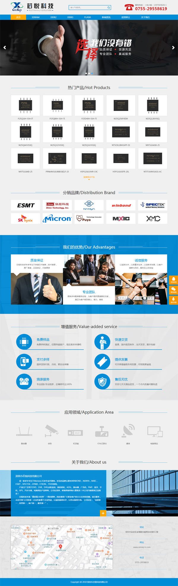 项目名称:深圳市芯悦科技有限公司建站合同 项目网址:www.cenray-ic.com 设计稿: 深圳市芯悦科技有限公司是一家多年专注于MemoryIC的专业代理商。涉及的品牌主要有WINBOND,NANYA,MXIC,ESMT,SP